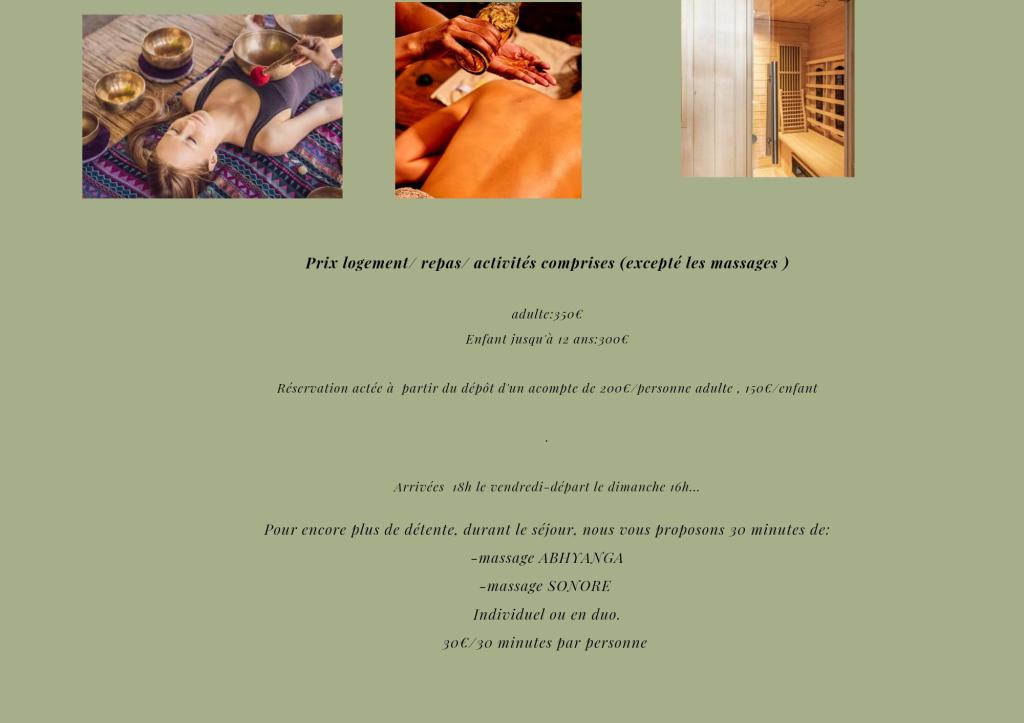 Prix logement/ repas/ activités comprises (excepté les massages )